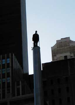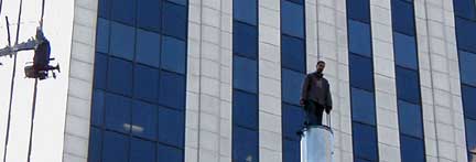about 12 stories high. He is a street magician named David Blaine. He is standing up there for 35 hours and then intends to jump off into some cardboard boxes. Not sure that I get it. But plenty of publicity and media. And he looks cool up there in a hooded tunic. |